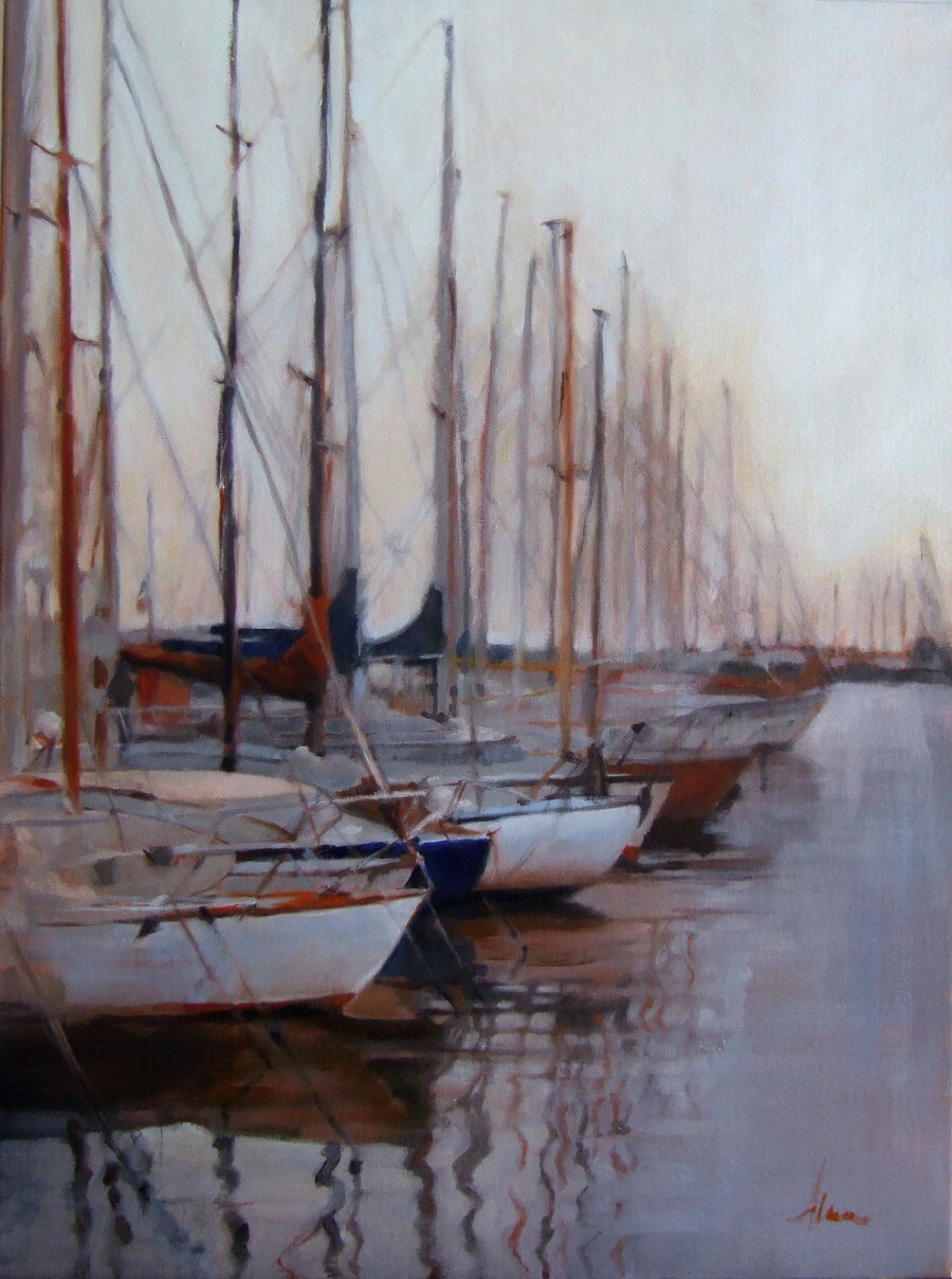 “Morning Ready to Sail” captures the early morning light rising behind a dock full of sailboats.