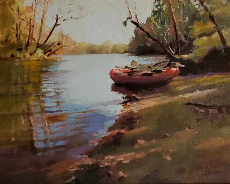 Along the Saluda River in South Carolina, the fish were ignoring our lures, so we found a lovely spot to take a break. The warmth of the autumn sun threading through the trees framed our red rubber raft and I saw a moment that begged to be painted. The tranquility is to be savored.