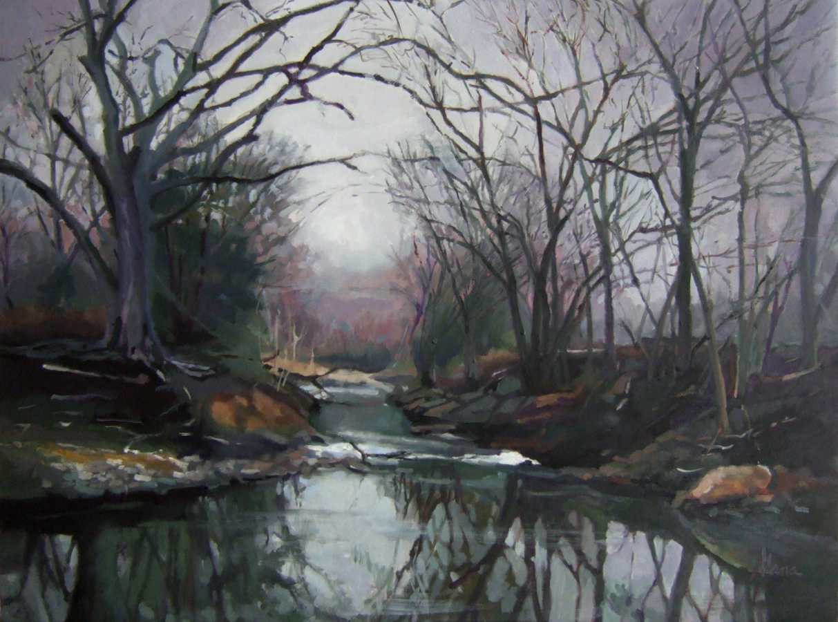 My granddaughter took the reference photo.  She gave me permission to use it as a reference for this painting.  The  feeling of a cold winter day is conveyed with neutrals and a bit of warmth in the distance.